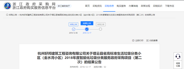 浙江省縉云縣省高標準生活垃圾分類小區(qū)(金水灣小區(qū))2018年度智能化垃圾分類服務政府采購項目發(fā)布結果公告,浙江聯(lián)運環(huán)境工程股份有限公司成為中標的社會資本方,中標金額33.45萬。
