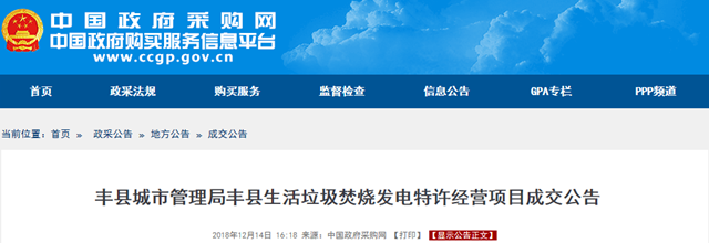 江蘇省豐縣生活垃圾焚燒發(fā)電特許經(jīng)營項目發(fā)布成交公告,中國光大綠色環(huán)保有限公司成為中標的社會資本方,生活垃圾處理服務費單價為65元/噸。