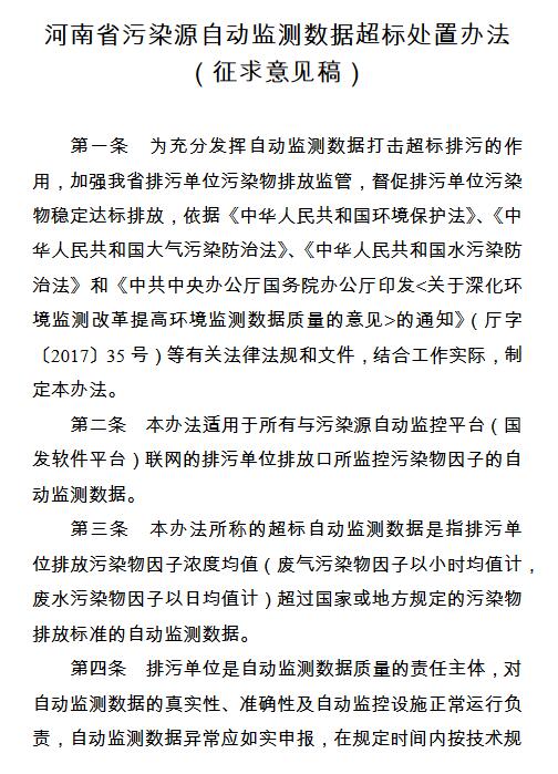 日前,河南印發(fā)《河南省污染源自動(dòng)監(jiān)測數(shù)據(jù)超標(biāo)處置辦法(征求意見稿)》。全文如下: