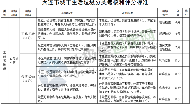 (二)考核內(nèi)容。對各區(qū)市縣和各街道的垃圾分類工作實行量化考核,考核項分為常規(guī)考核項、綜合考核項和社會監(jiān)督考核項,主要內(nèi)容包括:所轄居民分類小區(qū)、強制分類的公共機構(gòu)和公共場所的分類設(shè)施配置、分類收運管理及分類效果等方面,以及各區(qū)市縣和各街道開展垃圾分類管理組織保障、宣傳培訓和監(jiān)督檢查等情況。詳見附件《大連市城市生活垃圾分類考核和評分標準》。