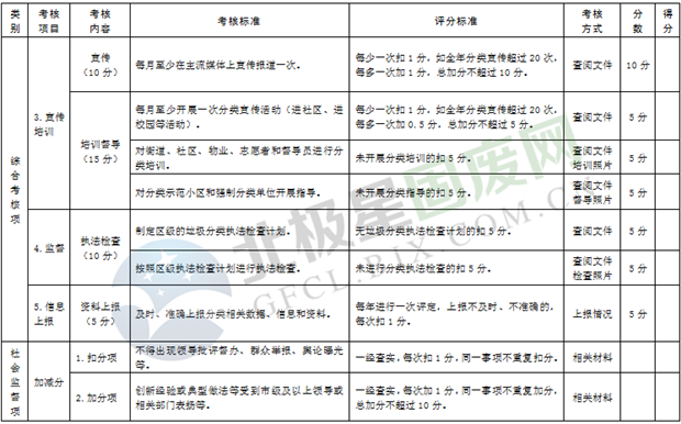 綜合考核:主要是考核各區(qū)市縣制度建設(shè)、運行管理、宣傳培訓、信息報送和日常檢查執(zhí)法等情況,由市垃圾分類工作領(lǐng)導小組人員采取現(xiàn)場檢查和資料查閱等方式進行。