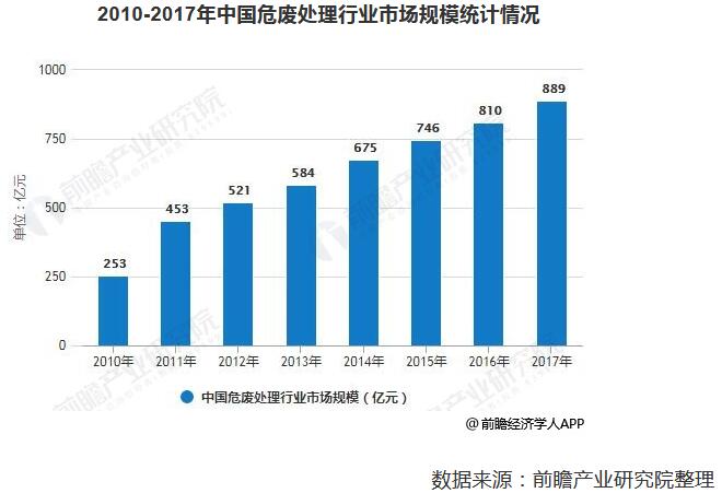 我國危廢處理行業(yè)自2001年左右起步,經(jīng)過十多年的發(fā)展,行業(yè)進(jìn)入快速增長階段,但也存在經(jīng)驗(yàn)和技術(shù)上的短板。由于我國危廢整體處置率較低,使得行業(yè)市場規(guī)模較小。據(jù)前瞻產(chǎn)業(yè)研究院發(fā)布的《中國危廢處理行業(yè)市場前瞻與投資戰(zhàn)略規(guī)劃分析報(bào)告》統(tǒng)計(jì)數(shù)據(jù)顯示,2010年中國危廢處理行業(yè)市場規(guī)模僅僅為253億元,2011年中國危廢處理行業(yè)市場規(guī)模增長至453億元。之后一直保持平穩(wěn)增長,到了2016年中國危廢處理行業(yè)市場規(guī)模突破800億元,截止到2017年中國危廢處理行業(yè)市場規(guī)模達(dá)到了約889億元。