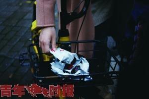 因周圍無垃圾桶,市民將垃圾暫放在自行車車籃內(nèi)。