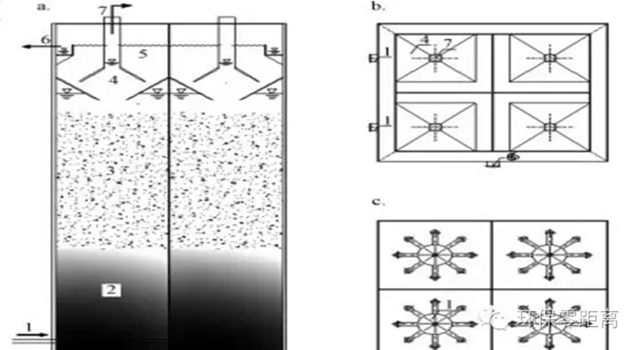 圖 2 UASB反應(yīng)器示意圖(a.剖視圖, b.頂視圖, c.底視圖; 1.進水, 2.污泥層, 3.懸浮層, 4.三相分離器, 5.沉淀區(qū), 6.出水, 7.氣體)