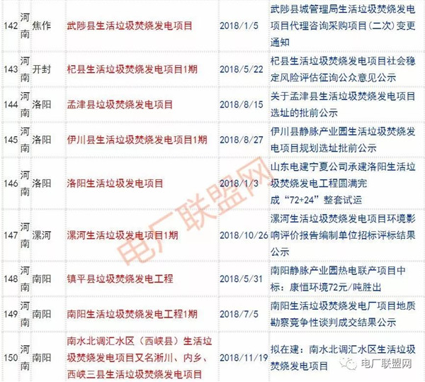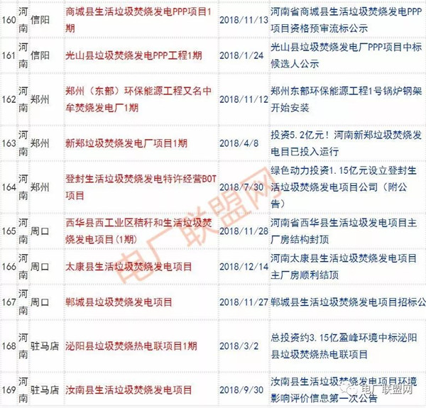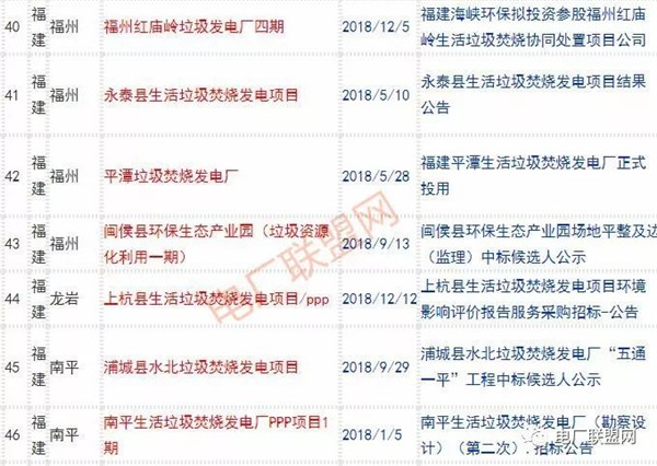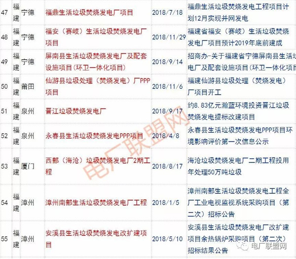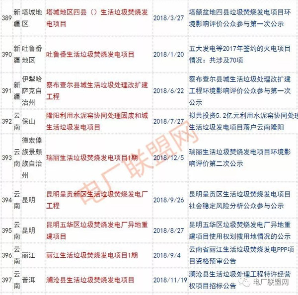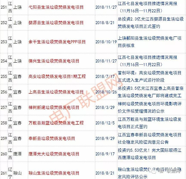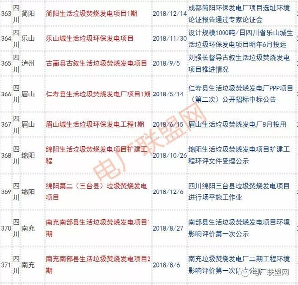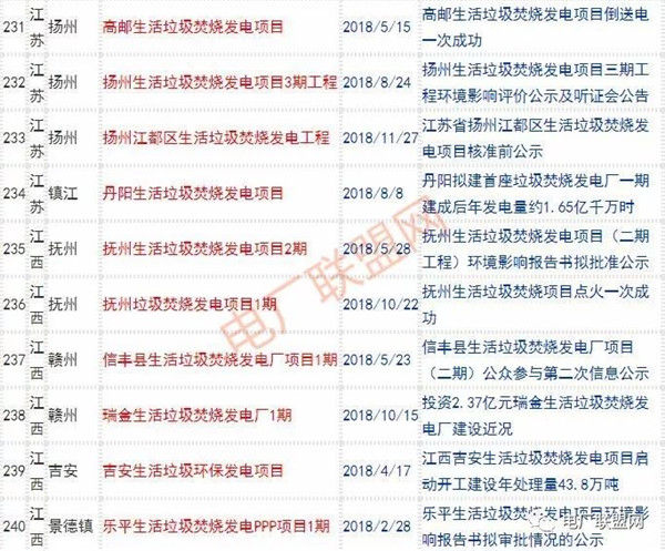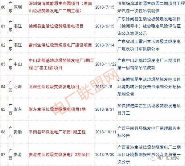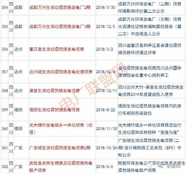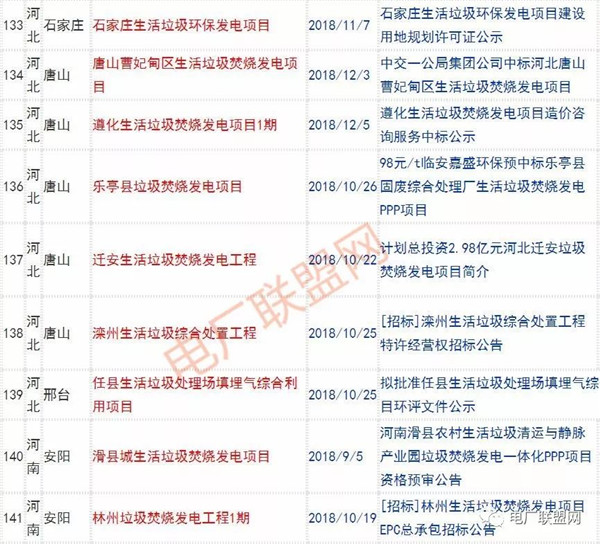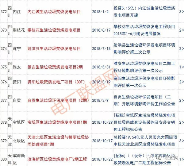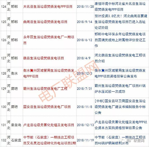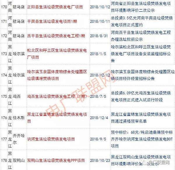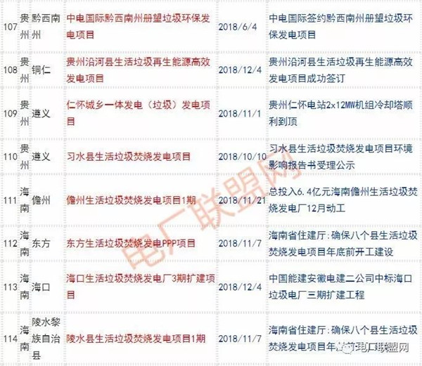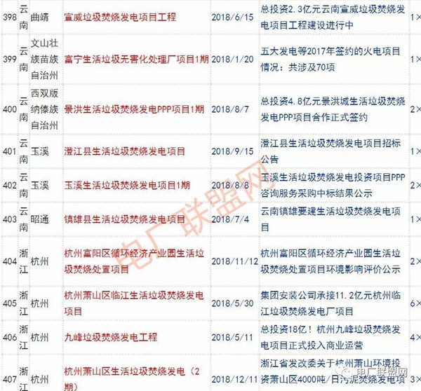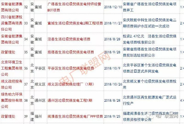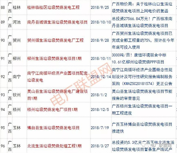 2018年新投入運(yùn)行的生活垃圾焚燒廠超過70座,在建項(xiàng)目166座,擬建項(xiàng)目201座.具體項(xiàng)目名單如下: