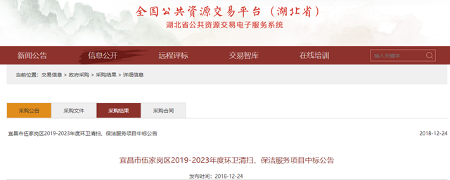 2018年12月24日,湖北省宜昌市伍家崗區(qū)2019-2023年度環(huán)衛(wèi)清掃、保潔服務(wù)項(xiàng)目中標(biāo)公告出爐,北控水務(wù)(中國(guó))投資有限公司成為中標(biāo)的社會(huì)資本方,中標(biāo)金額為2.24億。