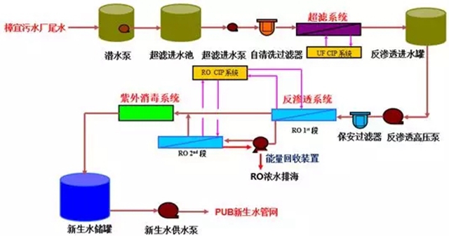 形式:消毒后產(chǎn)水進(jìn)入新生水水罐,然后通過新生水供水泵提升至水庫或工業(yè)用水點,供水量由 PUB統(tǒng)一調(diào)配。
