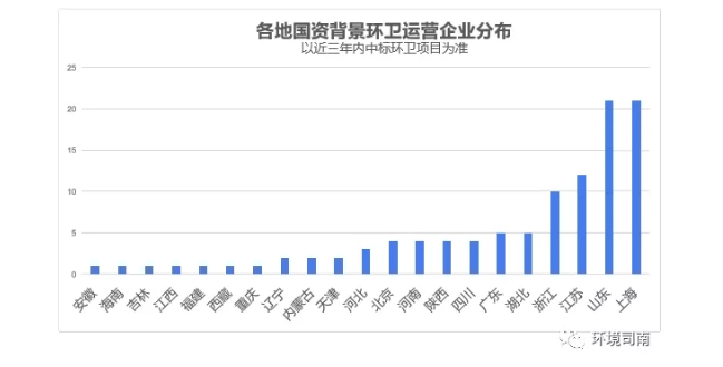 另外,據(jù)環(huán)境司南不完全統(tǒng)計(jì),除了活躍在招投標(biāo)領(lǐng)域的北京環(huán)境衛(wèi)生工程集團(tuán)、臨沂環(huán)境衛(wèi)生集團(tuán)、壽光環(huán)衛(wèi)集團(tuán)、日照環(huán)衛(wèi)集團(tuán)等集團(tuán)化企業(yè)外,近三年來中標(biāo)環(huán)衛(wèi)項(xiàng)目的各類國(guó)資背景環(huán)衛(wèi)運(yùn)營(yíng)企業(yè)數(shù)量超過100家,主要集中在華東地區(qū),華東地區(qū)的此類企業(yè)占全國(guó)總量的60%以上。
