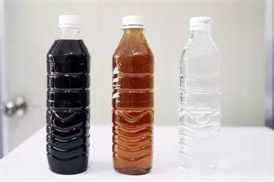 左為進(jìn)水口的垃圾滲濾液,中間一瓶是一級處理系統(tǒng)中間的一個環(huán)節(jié)取水,右為經(jīng)過二級處理后的出水。