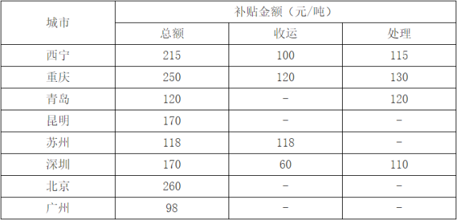 我國部分城市餐廚運營補貼