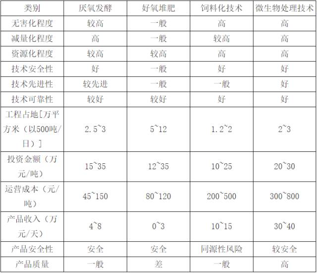 2)從經(jīng)濟(jì)效益比較,我們以日處理規(guī)模為500t計算,盡管資源化處理的費用最高,但其總收益也最大,綜合來看年均收益能達(dá)到 1435 萬元。資源化處理方式又細(xì)分為厭氧發(fā)酵、好氧堆肥、直接烘干做飼料和微生物處理等。