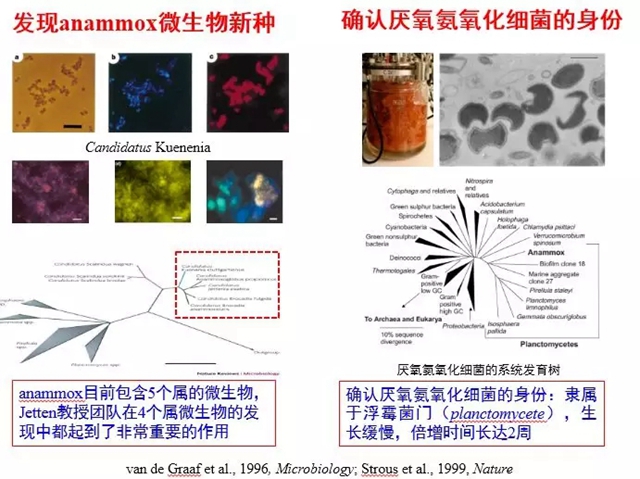 Anammox現(xiàn)象被發(fā)現(xiàn)之后,Kuenen教授的一位主要助手Mike Jetten博士專注于Anammox的微生物學(xué)研究,并在加盟荷蘭奈梅亨大學(xué)微生物系之后,組織團(tuán)隊展開了長期的基礎(chǔ)研究工作,發(fā)現(xiàn)和培養(yǎng)了新的參與氮、硫和碳轉(zhuǎn)化的微生物,采用分子生物學(xué)、結(jié)構(gòu)化學(xué)和宏基因組學(xué)從基因、細(xì)胞、個體和生態(tài)系統(tǒng)水平揭示相關(guān)微生物的反應(yīng)機(jī)理。