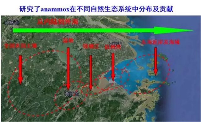 鄭平教授以前的學(xué)生--浙江大學(xué)胡寶蘭教授研究了Anammox細(xì)菌在中國不同自然生態(tài)系統(tǒng)中的分布及貢獻(xiàn)。她發(fā)現(xiàn),Anammox細(xì)菌廣泛存在于不同的自然生境中,且沉積物的有機(jī)碳和無機(jī)氮是影響Anammox分布的主要因素。她還發(fā)現(xiàn)人類活動影響了Anammox菌的分布,甚至特定Anammox菌可作為人類活動的指示菌。