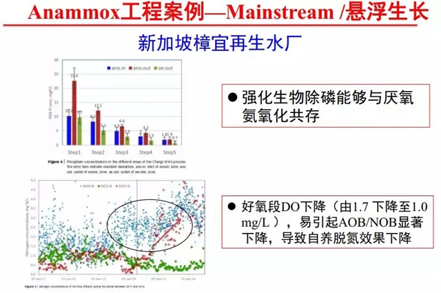 除了污泥消化液、工業(yè)廢水,近五年全球擴(kuò)大了對Anammox在城市污水主流程中的應(yīng)用。新加坡樟宜再生水廠是新加坡最大的再生水廠,也是國際上首個強(qiáng)化生物除磷與厭氧氨氧化在大型污水廠共存的案例。短污泥齡和適宜溶解氧是實現(xiàn)懸浮游離厭氧氨氧化菌生長的必要條件,在好氧區(qū)實現(xiàn)部分硝化和亞硝酸鹽積累,缺氧區(qū)進(jìn)行厭氧氨氧化反應(yīng)(脫氮貢獻(xiàn)率30%),整體工藝能耗降低10%-30%,池容減少10%-40%。新加坡公用事業(yè)局的科學(xué)家曹業(yè)始博士在該污水廠Anammox技術(shù)的設(shè)計和應(yīng)用中發(fā)揮了重要作用。
