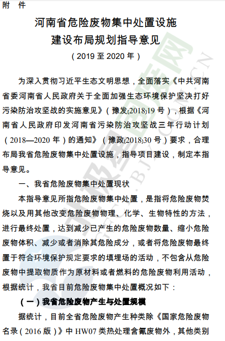 為深入貫徹習(xí)近平生態(tài)文明思想,全面落實《中共河南省委河南省人民政府關(guān)于全面加強(qiáng)生態(tài)環(huán)境保護(hù)堅決打好污染防治攻堅戰(zhàn)的實施意見》(豫發(fā)﹝2018﹞19號),根據(jù)《河南省人民政府印發(fā)河南省污染防治攻堅戰(zhàn)三年行動計劃(2018—2020年)的通知》(豫政﹝2018﹞30號)要求,我廳起草了《河南省危險廢物集中處置設(shè)施建設(shè)布局規(guī)劃指導(dǎo)意見》,現(xiàn)印發(fā)給你們,請結(jié)合實際,認(rèn)真抓好落實。