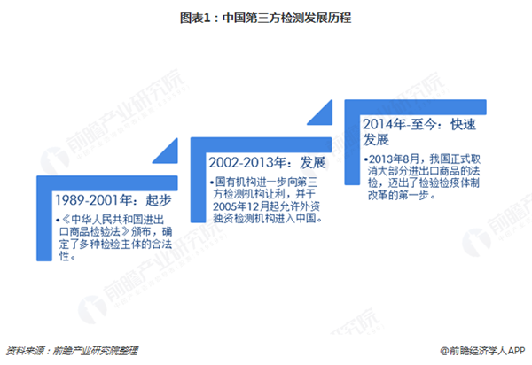 我國(guó)檢驗(yàn)檢測(cè)起源于1989年,明顯晚于國(guó)外發(fā)達(dá)國(guó)家。其中《中華人民共和國(guó)進(jìn)出口商品檢驗(yàn)法》的頒布,確定了多種檢驗(yàn)主體的合法性。在這一階段我國(guó)檢驗(yàn)檢測(cè)以國(guó)有機(jī)構(gòu)為主。2002年之后,國(guó)有機(jī)構(gòu)進(jìn)一步向第三方檢測(cè)機(jī)構(gòu)讓利,外資獨(dú)資檢測(cè)機(jī)構(gòu)也隨之被允許進(jìn)入中國(guó)市場(chǎng),中國(guó)檢驗(yàn)檢測(cè)市場(chǎng)主體規(guī)模有了根本性的改變。2014年以第三方檢測(cè)機(jī)構(gòu)為代表的我國(guó)檢驗(yàn)檢測(cè)行業(yè)開始實(shí)現(xiàn)快速發(fā)展。