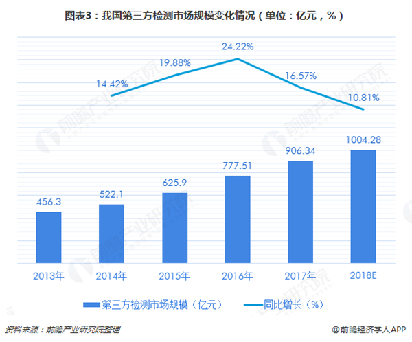 根據(jù)前瞻產(chǎn)業(yè)研究院發(fā)布的《中國(guó)第三方檢測(cè)行業(yè)發(fā)展趨勢(shì)與投資決策支持研究報(bào)告》數(shù)據(jù)顯示,2017年我過第三方檢測(cè)市場(chǎng)規(guī)模在900億元左右,近年來維持在10%以上的較高增速。預(yù)計(jì)2018全年第三方檢測(cè)市場(chǎng)規(guī)模將突破千億元大關(guān),我國(guó)第三方檢測(cè)市場(chǎng)將達(dá)到新的高度。