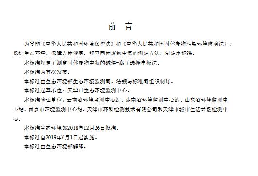 日前生態(tài)環(huán)境部發(fā)布了國(guó)家環(huán)境保護(hù)標(biāo)準(zhǔn):《固體廢物氟的測(cè)定 堿熔-離子選擇電極法》(HJ 999-2018),具體內(nèi)容如下: