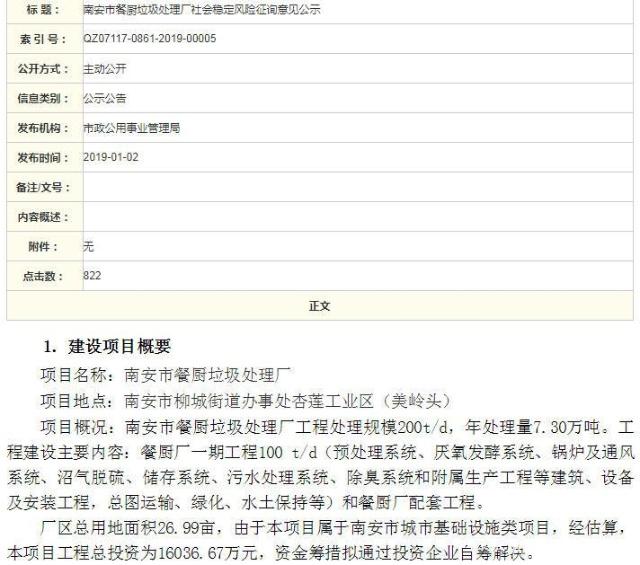 2019年1月2日,南安市政公用事業(yè)管理局發(fā)布兩份《社會(huì)穩(wěn)定風(fēng)險(xiǎn)征詢意見公示》,主要內(nèi)容關(guān)于南安市生活垃圾焚燒發(fā)電廠提級改造,以及南安市餐廚垃圾處理廠建設(shè)兩項(xiàng)工程。具體如下: