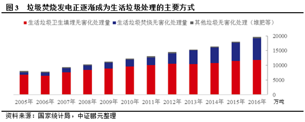 垃圾焚燒發(fā)電具有其他垃圾處理方式無法比擬的優(yōu)勢,其處理規(guī)模上升較快。生活垃圾處理大致分為衛(wèi)生填埋、焚燒和堆肥等方式,前兩種方式為主。從全國來看,衛(wèi)生填埋目前是生活垃圾無害化處理的主流方式,2016年占比60.32%,但垃圾焚燒符合“垃圾處理十三五規(guī)劃”中的“減量化、無害化、資源化”三原則,垃圾焚燒后,一般體積可減少90%以上,重量減輕80%以上。垃圾焚燒后再填埋,可以有效地減少對土地資源的占用。高溫焚燒后可消除垃圾中大量有害病菌、有毒物質(zhì)和惡臭氣體,同時(shí)垃圾滲濾液可以高溫分解,避免污染地下水。垃圾焚燒后產(chǎn)生的熱能可用于發(fā)電供熱,燃燒后的廢渣可以用于建筑材料生產(chǎn),實(shí)現(xiàn)資源的綜合利用。