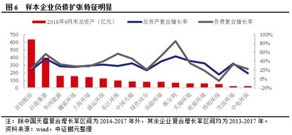 樣本企業(yè)總資產(chǎn)規(guī)模差異較大,負(fù)債帶動資產(chǎn)擴(kuò)張?zhí)卣髅黠@。從2018年9月末資產(chǎn)規(guī)模來看,首創(chuàng)股份居首,啟迪桑德位于第二,均超過350億元,100-200億元的企業(yè)有4家,100億元以下企業(yè)10家。生活垃圾焚燒發(fā)電領(lǐng)域市場空間大,國家支持力度強(qiáng),項(xiàng)目運(yùn)營期經(jīng)濟(jì)效益穩(wěn)定,在PPP政策的推動下,業(yè)內(nèi)企業(yè)積極通過投資、并購占領(lǐng)市場,2013-2017年樣本企業(yè)總資產(chǎn)復(fù)合增速29.83%,16家樣本企業(yè)中有11家負(fù)債年復(fù)合增速超過總資產(chǎn)復(fù)合增速。