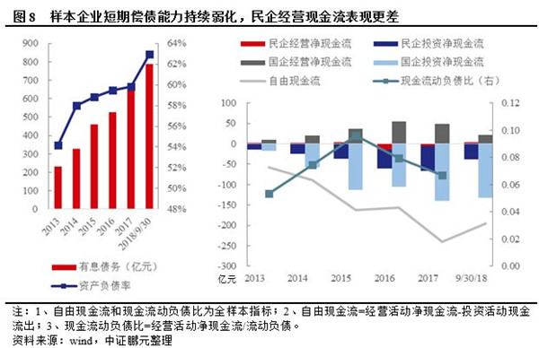 民營企業(yè)經(jīng)營現(xiàn)金流表現(xiàn)較差,投資活動對債務(wù)資金依賴性更高,再融資收縮對民企影響更大。樣本企業(yè)2016年以來經(jīng)營現(xiàn)金流表現(xiàn)不佳,自由現(xiàn)金流缺口不斷增加,現(xiàn)金流動負(fù)債比持續(xù)走低,短期償債能力弱化。相比之下,民營企業(yè)經(jīng)營凈現(xiàn)金流表現(xiàn)更差,投資活動對外部籌資依賴性很高。受銀行信貸、非標(biāo)融資渠道收緊以及債市遇冷等外部因素影響,2018年前三季度民企籌資活動凈現(xiàn)金流僅為9.08億元,而2017年全年為68.41億元,外部融資急劇收縮,導(dǎo)致民企信用風(fēng)險(xiǎn)逐漸暴露。
