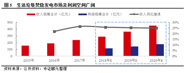 根據(jù)垃圾處理“十三五”規(guī)劃,到2020年底,設(shè)市城市生活垃圾焚燒處理能力占無害化處理總能力的50%以上,其中東部地區(qū)達(dá)到60%以上。生活垃圾清運(yùn)量上升及垃圾焚燒發(fā)電處理方式占比提升均可為行業(yè)增長提供支撐。以2016年生活垃圾焚燒無害化日處理能力25.59萬噸/日為基數(shù),按產(chǎn)能利用率80%,垃圾處理單價(jià)50元/噸,噸上網(wǎng)發(fā)電量280度,上網(wǎng)電價(jià)0.65元/度,單位產(chǎn)能投資額46萬元/萬噸/日,運(yùn)營、設(shè)備制造及安裝、PPP工程業(yè)務(wù)利潤率分別為40%、35%、30%測算,中證鵬元預(yù)測2018-2020年生活垃圾焚燒發(fā)電行業(yè)市場空間分別為289.11億元、361.92億元和451.69億元,增速分別為25.67%、25.18%和24.80%,利潤空間分別為113.94億元、142.30億元和177.27億元。