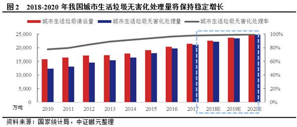 我國生活垃圾處理市場規(guī)模將保持增長?!丁笆濉比珖擎?zhèn)生活垃圾無害化處理設(shè)施建設(shè)規(guī)劃》(以下簡稱“垃圾處理十三五規(guī)劃”)指出,“十三五”期間全國規(guī)劃新增生活垃圾無害化處理能力50.97萬噸/日(包含“十二五”續(xù)建12.9萬噸/日),全國城鎮(zhèn)生活垃圾無害化處理設(shè)施建設(shè)總投資約2,518.4 億元。到2020年底,直轄市、計(jì)劃單列市和省會城市(建成區(qū))生活垃圾無害化處理率達(dá)到100%,其他設(shè)市城市、縣城(建成區(qū))、建制鎮(zhèn)生活垃圾無害化處理率分別達(dá)到95%、80%、70%以上。中證鵬元以2017年城市生活垃圾無害化處理率97.74%和城市生活垃圾清運(yùn)量增速5.69%為基準(zhǔn),假定無害化處理率每年上升0.06個(gè)百分點(diǎn),未來每年城市生活垃圾清運(yùn)量增速為5%(考慮經(jīng)濟(jì)下行壓力,保守估計(jì)),測算2018-2020年我國城市生活垃圾無害化處理量分別為2.22億噸、2.35億噸和2.48億噸。根據(jù)2018年9月中共中央、國務(wù)院印發(fā)的《鄉(xiāng)村振興戰(zhàn)略規(guī)劃(2018-2022年)》要求,推進(jìn)農(nóng)村生活垃圾治理、農(nóng)村污水處理、實(shí)施廁所革命、消除農(nóng)村黑臭水體、提升村容村貌是補(bǔ)齊突出短板的重要內(nèi)容。鄉(xiāng)村振興戰(zhàn)略作為2017年及2018年中央經(jīng)濟(jì)工作會議部署的重點(diǎn)工作,正逐步得到實(shí)施。隨著農(nóng)村未處理垃圾存量的消化和處理范圍擴(kuò)大,未來農(nóng)村垃圾處理規(guī)模有較大增長空間。