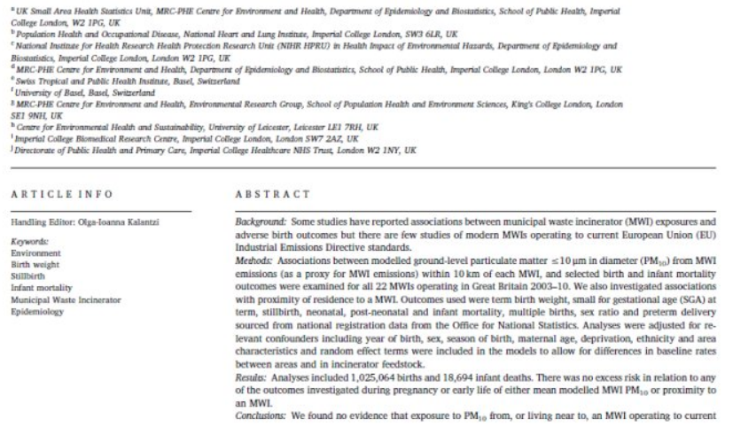 該研究由英國公共衛(wèi)生部門,英國大學和公共機構資助,分析了2003—2010年間在英國運營的主要生活垃圾焚燒廠(MWI)排放的PM10潛在影響(這些焚燒廠達到歐盟標準運行)。研究項目評估了生活垃圾焚燒廠附近新生兒數(shù)量超過100萬,評估參數(shù)包括:出生體重,足月胎齡,死胎,新生兒,新生兒和嬰兒死亡率,多胞胎,性別比和早產。
