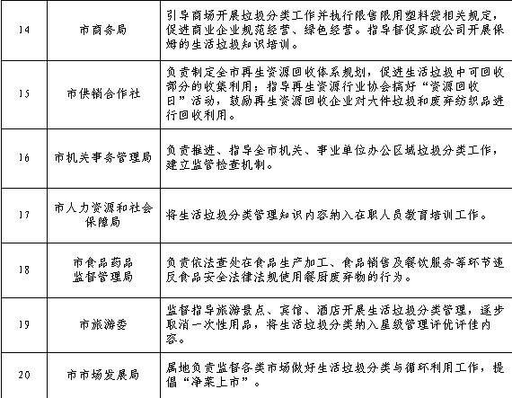 2020年前,在市城區(qū)、縣城區(qū)范圍內(nèi)實(shí)施生活垃圾強(qiáng)制分類。實(shí)施垃圾強(qiáng)制分類區(qū)域內(nèi)以下主體,負(fù)責(zé)對(duì)其產(chǎn)生的生活垃圾進(jìn)行分類。