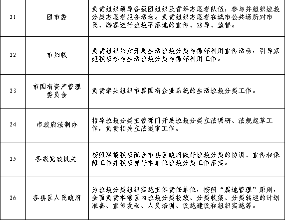 2020年前,在市城區(qū)、縣城區(qū)范圍內(nèi)實(shí)施生活垃圾強(qiáng)制分類。實(shí)施垃圾強(qiáng)制分類區(qū)域內(nèi)以下主體,負(fù)責(zé)對(duì)其產(chǎn)生的生活垃圾進(jìn)行分類。