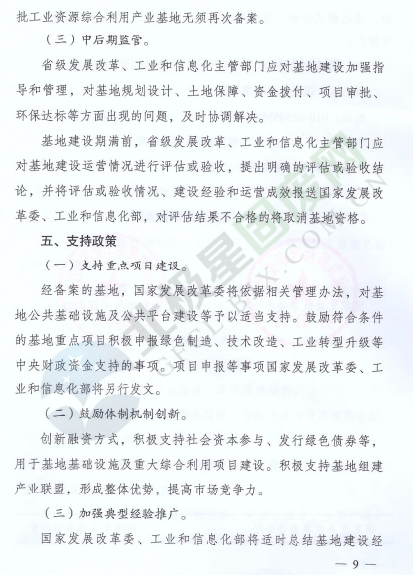 為落實(shí)《中華人民共和國(guó)經(jīng)濟(jì)和社會(huì)發(fā)展第十三個(gè)五年規(guī)劃綱要》《循環(huán)發(fā)展引領(lǐng)計(jì)劃》和《工業(yè)綠色發(fā)展規(guī)劃》,促進(jìn)產(chǎn)業(yè)集聚,提高資源綜合利用水平,推動(dòng)資源綜合利用產(chǎn)業(yè)高質(zhì)量發(fā)展,近日,國(guó)家發(fā)展改革委辦公廳和工業(yè)和信息化部辦公廳印發(fā)了關(guān)于推進(jìn)大宗固體廢棄物綜合利用產(chǎn)業(yè)集聚發(fā)展的通知。全文如下: