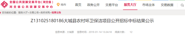 2019年1月14日,河北省大城縣農(nóng)村環(huán)衛(wèi)保潔項(xiàng)目發(fā)布中標(biāo)結(jié)果公示,啟迪桑德環(huán)境資源股份有限公司獲得二標(biāo)段,中標(biāo)金額為2254.93萬/年,服務(wù)期限為3年。