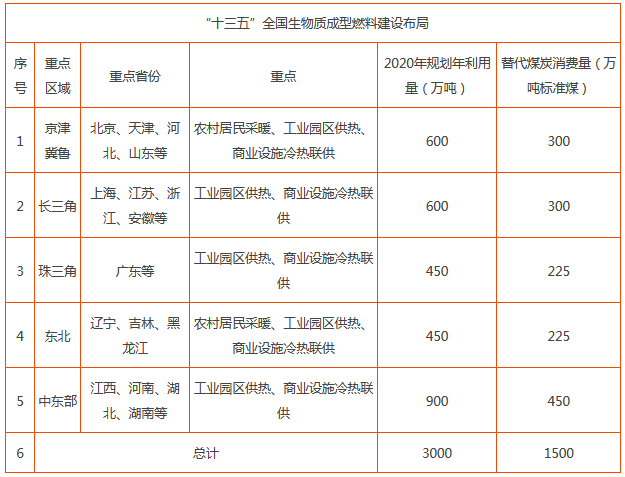 在具備資源和市場條件的地區(qū),特別是在大氣污染形勢嚴(yán)峻、淘汰燃煤鍋爐任務(wù)較重的京津冀魯、長三角、珠三角、東北等區(qū)域,以及散煤消費(fèi)較多的農(nóng)村地區(qū),加快推廣生物質(zhì)成型燃料鍋爐供熱,為村鎮(zhèn)、工業(yè)園區(qū)及公共和商業(yè)設(shè)施提供可再生清潔熱力。