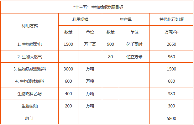 到2020年,生物質(zhì)能基本實(shí)現(xiàn)商業(yè)化和規(guī)模化利用。生物質(zhì)能年利用量約5800萬噸標(biāo)準(zhǔn)煤。生物質(zhì)發(fā)電總裝機(jī)容量達(dá)到1500萬千瓦,年發(fā)電量900億千瓦時(shí),其中農(nóng)林生物質(zhì)直燃發(fā)電700萬千瓦,城鎮(zhèn)生活垃圾焚燒發(fā)電750萬千瓦,沼氣發(fā)電50萬千瓦;生物天然氣年利用量80億立方米;生物液體燃料年利用量600萬噸;生物質(zhì)成型燃料年利用量3000萬噸。