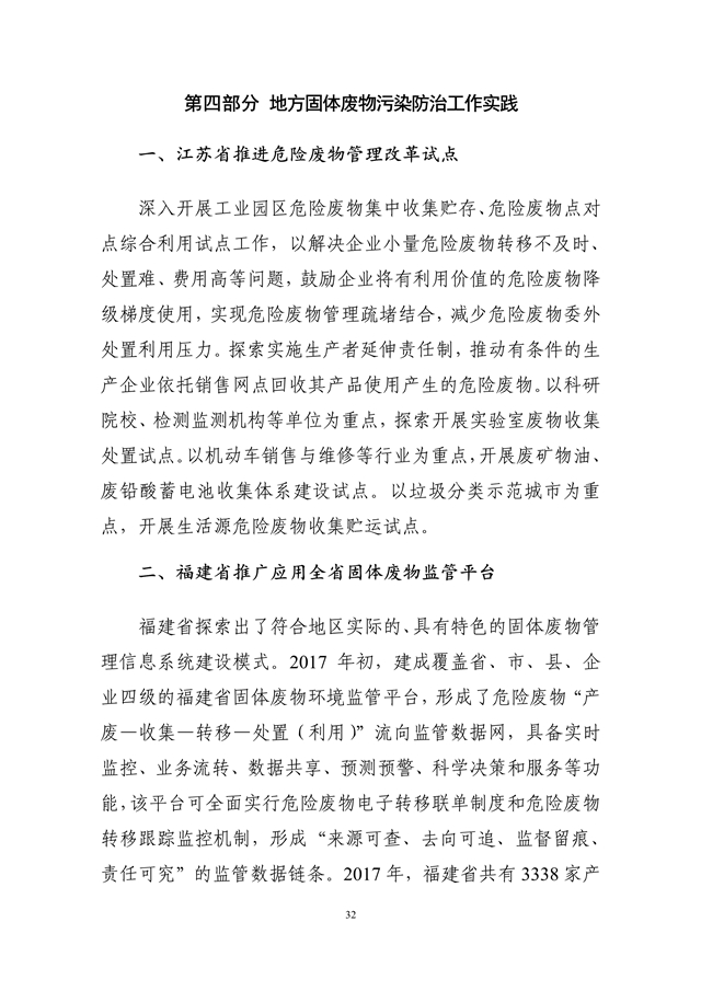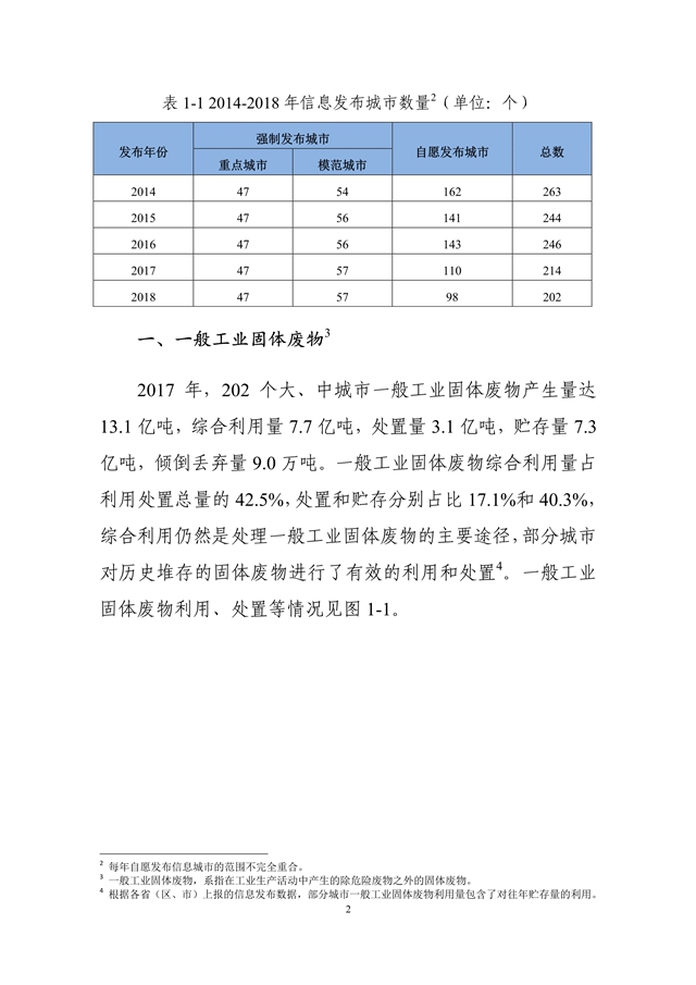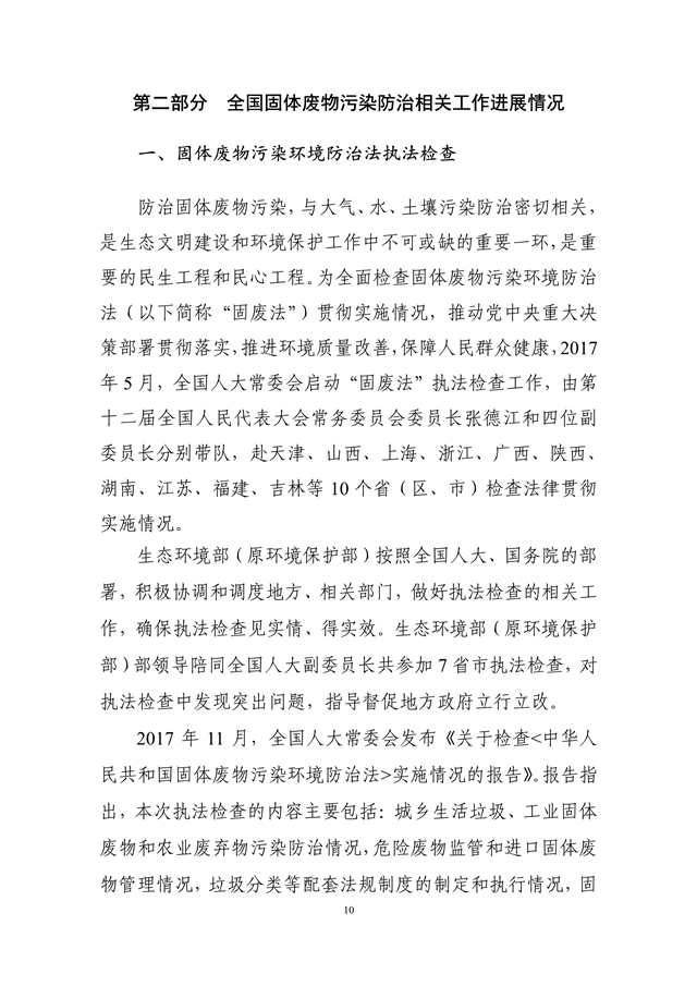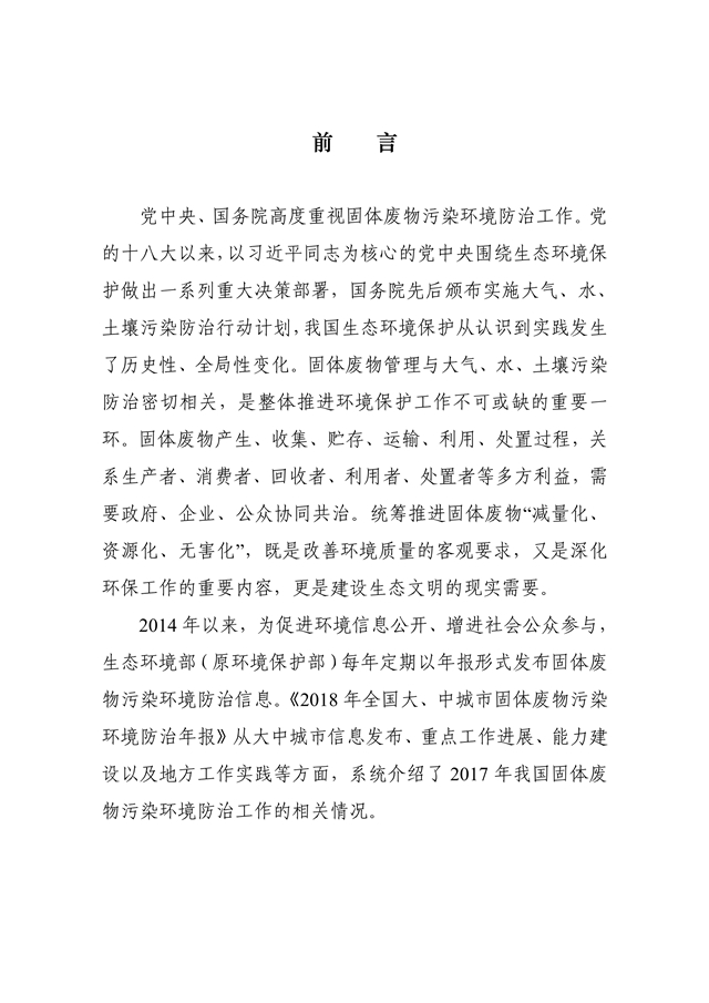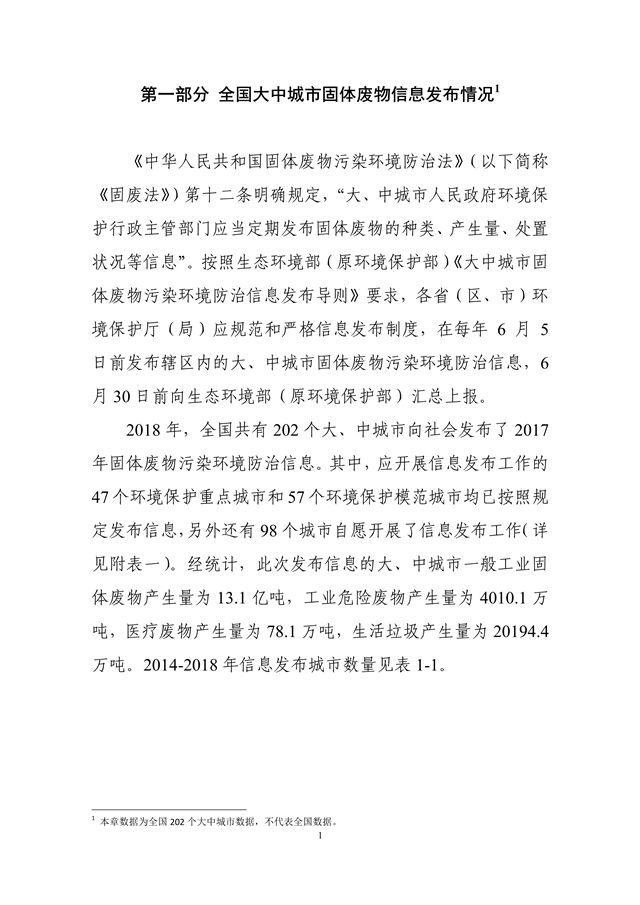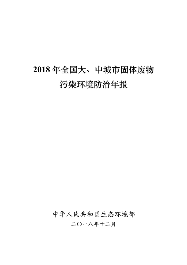 生態(tài)環(huán)境部發(fā)布了《2018年全國大、中城市固體廢物污染環(huán)境防治年報》,從大中城市信息發(fā)布、重點工作進展、能力建設(shè)以及地方工作實踐等方面,系統(tǒng)介紹了我國固體廢物污染環(huán)境防治工作的相關(guān)情況。2014 年以來,為促進環(huán)境信息公開、增進社會公眾參與, 生態(tài)環(huán)境部(原環(huán)境保護部)每年定期以年報形式發(fā)布固體廢物污染環(huán)境防治信息。