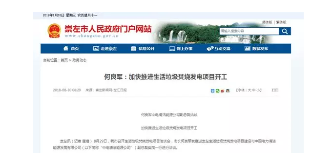 而根據(jù)政府官媒報道顯示,2018年8月29日,崇左市召開生活垃圾焚燒發(fā)電項目洽談會,市長何良軍就推進崇左生活垃圾焚燒發(fā)電項目建設(shè)與中國電力清潔能源發(fā)展有限公司副總裁柴茂一行進行洽談,旨在加快推進生活垃圾焚燒發(fā)電項目開工。
