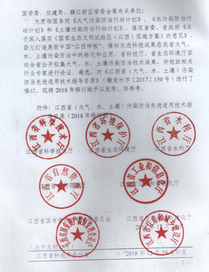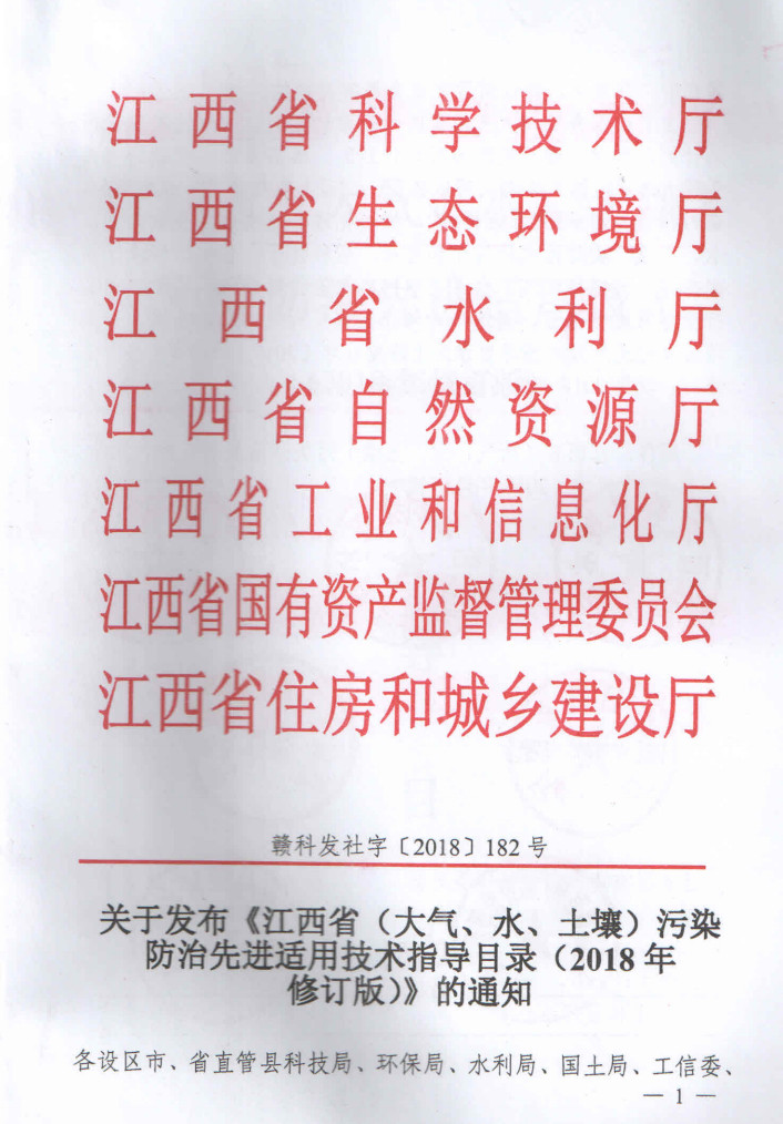 近日,江西省江西省工業(yè)和信息化廳、江西省住房和城鄉(xiāng)建設(shè)廳、江西省科學(xué)技術(shù)廳、江西省水利廳、江西省生態(tài)環(huán)境廳、江西省國有資產(chǎn)監(jiān)督管理委員會等多部門聯(lián)合發(fā)布了江西?。ù髿?、水、土壤)污染 防治先進適用技術(shù)指導(dǎo)目錄(2018年修訂版),全文如下: