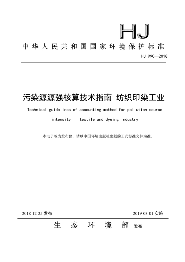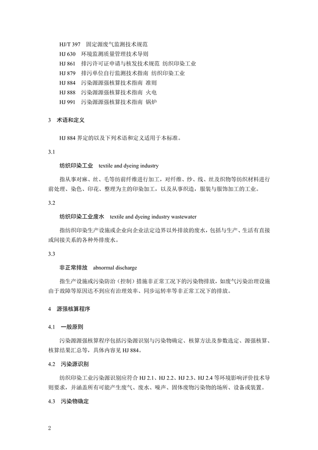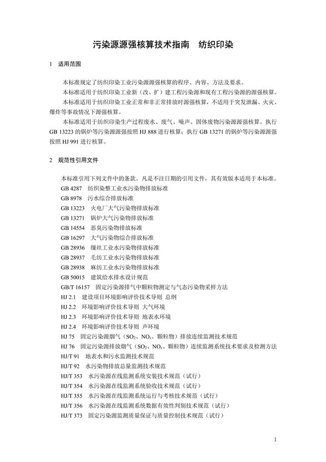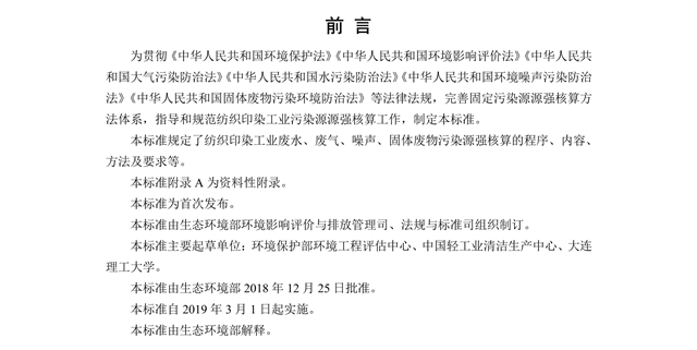 為貫徹《中華人民共和國環(huán)境保護(hù)法》《中華人民共和國環(huán)境影響評(píng)價(jià)法》《中華人民共和國大氣污染防治法》《中華人民共和國水污染防治法》《中華人民共和國環(huán)境噪聲污染防治法》《中華人民共和國固體廢物污染環(huán)境防治法》等法律法規(guī),完善固定污染源源強(qiáng)核算方法體系,指導(dǎo)和規(guī)范紡織印染工業(yè)污染源源強(qiáng)核算工作,制定本標(biāo)準(zhǔn)。本標(biāo)準(zhǔn)規(guī)定了紡織印染工業(yè)廢水、廢氣、噪聲、固體廢物污染源強(qiáng)核算的程序、內(nèi)容、方法及要求等。本標(biāo)準(zhǔn)附錄 A 為資料性附錄。本標(biāo)準(zhǔn)為首次發(fā)布。