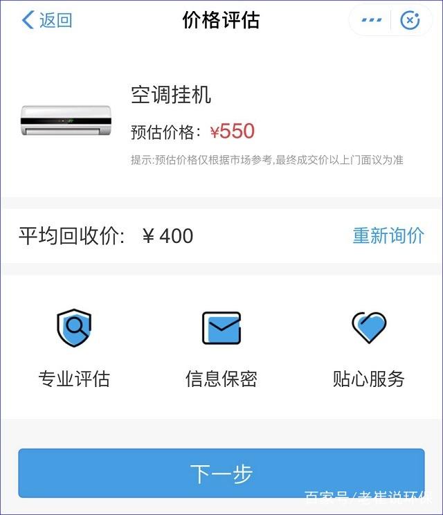 舉個例子,老崔家里有個需要回收的空調(diào),選擇掛機或柜機,品牌、出廠年限、空調(diào)匹數(shù)、內(nèi)外機破損程度、功能使用情況,系統(tǒng)會自動給一個預估價(成交價以上門面議為準)。