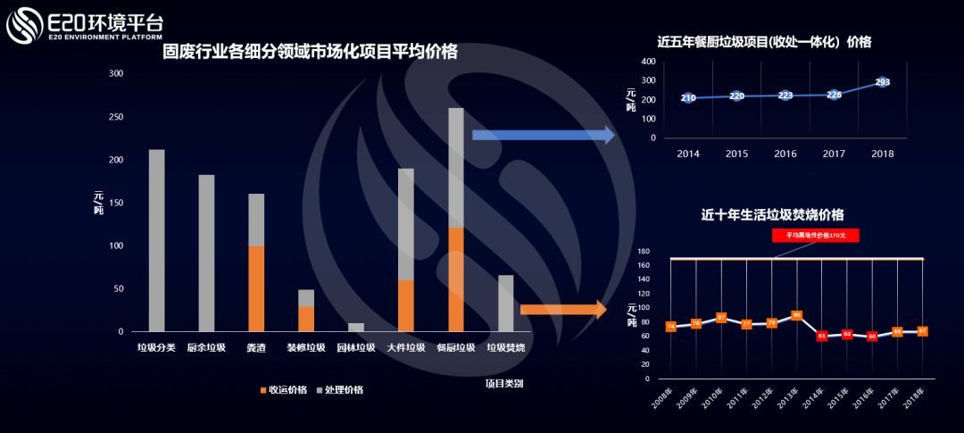 E20研究院多年來(lái)持續(xù)跟蹤關(guān)注固廢各細(xì)分領(lǐng)域市場(chǎng)化投資運(yùn)營(yíng)項(xiàng)目的服務(wù)價(jià)格。對(duì)比水務(wù)行業(yè),總體來(lái)看固廢行業(yè)收運(yùn)環(huán)節(jié)較為特殊,在很多固廢細(xì)分領(lǐng)域的項(xiàng)目當(dāng)中都單獨(dú)出現(xiàn)了收運(yùn)價(jià)格,因此我們將收運(yùn)價(jià)與處置價(jià)分開(kāi)來(lái)看。近年來(lái)大家關(guān)注較多的是垃圾焚燒的項(xiàng)目?jī)r(jià)格,我們可以看到近10年來(lái),我國(guó)垃圾焚燒市場(chǎng)化項(xiàng)目的BOT價(jià)格基本穩(wěn)定,略有升高,但同時(shí)可以注意到,屬地性項(xiàng)目的價(jià)格較市場(chǎng)化項(xiàng)目來(lái)講高出很多,這也從側(cè)面反映了市場(chǎng)化對(duì)于降低成本的作用。