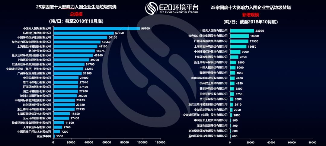 那么,回到2018年度的業(yè)績(jī)盤點(diǎn)。據(jù)E20數(shù)據(jù)中心統(tǒng)計(jì),25家固廢十大影響力入圍企業(yè)的垃圾焚燒業(yè)績(jī)?nèi)缦聢D所示: