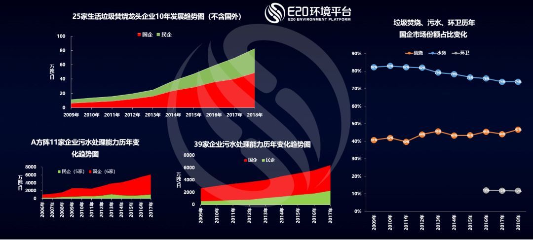 上圖所示為E20研究院數(shù)據(jù)中心統(tǒng)計(jì)近年來(lái)我國(guó)生活垃圾焚燒及污水處理行業(yè)國(guó)企及民企業(yè)績(jī)?cè)鲩L(zhǎng)的變化。右圖中可以看到,國(guó)企市場(chǎng)占比基本穩(wěn)定,污水處理行業(yè)保持在75%左右(這次E20研究院數(shù)據(jù)中興加入了39家來(lái)分析十年的國(guó)進(jìn)民退走勢(shì),與左側(cè)之前的11家的統(tǒng)計(jì)有很大的不同,值得關(guān)注),垃圾焚燒行業(yè)保持在45%左右,環(huán)衛(wèi)則穩(wěn)定在12%。