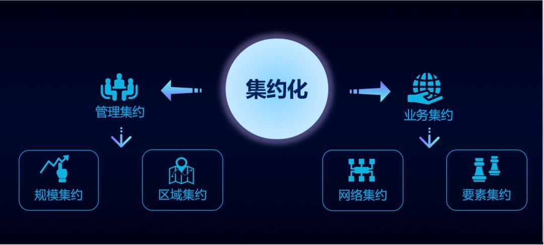 為了深入分析如何達(dá)成提高運(yùn)營(yíng)長(zhǎng)期效率這個(gè)目標(biāo),E20研究院將其集約化類型劃分為兩大類,四小類進(jìn)行解析。分別是管理集約型,包括區(qū)域集約型和規(guī)模集約型兩類;業(yè)務(wù)集約型,包括網(wǎng)絡(luò)集約型和要素集約型兩類。總體來(lái)講,集約化的核心就是集中管理,提高效率。