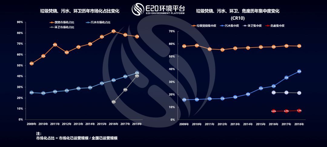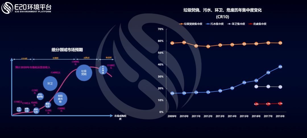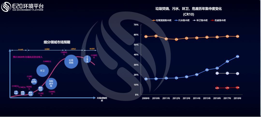 而通過(guò)E20研究院數(shù)據(jù)中心對(duì)各細(xì)分領(lǐng)域龍頭企業(yè)的跟蹤調(diào)研發(fā)現(xiàn),我國(guó)生活垃圾焚燒領(lǐng)域市場(chǎng)集中度CR10(前十家企業(yè)的市場(chǎng)占有率之和)近10年來(lái)穩(wěn)定在58%左右;污水處理行業(yè)集中度CR10持續(xù)增長(zhǎng),至2018年達(dá)到38%左右;環(huán)衛(wèi)行業(yè)和危廢行業(yè)的市場(chǎng)集中度CR10均基本穩(wěn)定,分別保持在20%和7%左右,市場(chǎng)仍較分散,這個(gè)原因是市場(chǎng)釋放非常快,新進(jìn)入者眾多,仍處于行業(yè)的快速上升期。