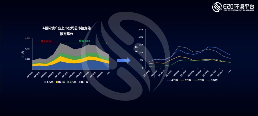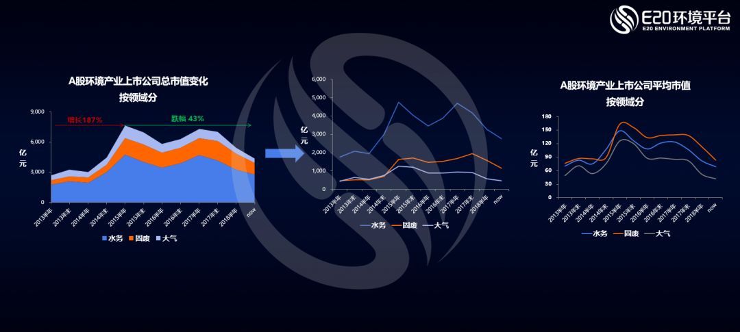 首先薛濤從上市公司角度分析了目前A股環(huán)保板塊的現(xiàn)狀。下面的左圖中可以看到,自2018年以來(lái),環(huán)保板塊的整體市值已縮水43%,是所有板塊中跌幅最大的板塊之一,這一現(xiàn)狀也引來(lái)各家券商行研“環(huán)保是最大的雷”的總結(jié)。
