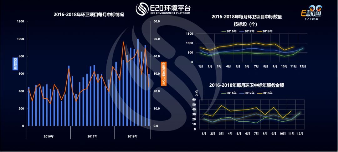上圖可見(jiàn),根據(jù)E20環(huán)境平臺(tái)E標(biāo)通對(duì)近三年的數(shù)據(jù)分析,可以看出,環(huán)衛(wèi)項(xiàng)目每個(gè)月的中標(biāo)數(shù)量呈現(xiàn)在波動(dòng)中上升趨勢(shì),這與E20研究院對(duì)環(huán)衛(wèi)市場(chǎng)化發(fā)展的趨勢(shì)預(yù)判高度吻合。中標(biāo)金額也呈上揚(yáng)趨勢(shì),環(huán)衛(wèi)市場(chǎng)火熱程度可見(jiàn)一斑。