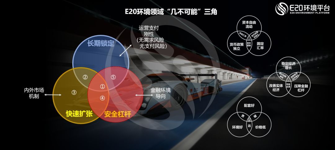 正如前面所講,為主導(dǎo)朋友圈自媒體往往充斥了各種恐慌,比如廣泛流傳的外匯不可能三角、金融市場(chǎng)不可能三角、以及房地產(chǎn)不可能三角理論體系。不過(guò),這種三角模型很符合E20研究院所習(xí)慣的圖形邏輯組合的分析思路,所以我們回顧過(guò)去,也為環(huán)境企業(yè)家總結(jié)了 “E20環(huán)境領(lǐng)域‘幾不可能’三角“。結(jié)合前面提到的PPP方面的研究,E20研究院選取了長(zhǎng)期鎖定、快速擴(kuò)張以及安全杠桿作為構(gòu)建“E20環(huán)境領(lǐng)域幾不可能三角”的三個(gè)要素。這三個(gè)要素的綜合內(nèi)外分析對(duì)于任何環(huán)保企業(yè),無(wú)論是技術(shù)型企業(yè)還是投資運(yùn)營(yíng)型企業(yè),都可以作為戰(zhàn)略規(guī)劃的參考。(相關(guān)閱讀→ 讀薛濤解析環(huán)保PPP之“幾不可能三角”:思維碰撞殊途同歸)