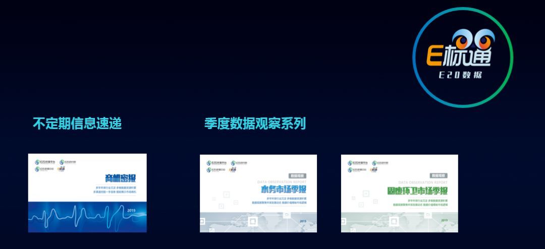 E20研究院數(shù)據(jù)中心將以E標(biāo)通為基礎(chǔ),從環(huán)衛(wèi)市場(chǎng)化機(jī)會(huì)出發(fā),兼顧污水、垃圾等投資運(yùn)營(yíng)細(xì)分領(lǐng)域,并逐步擴(kuò)展到工程、設(shè)備等各細(xì)分領(lǐng)域,為圈層會(huì)員企業(yè)提供免費(fèi)“環(huán)衛(wèi)商機(jī)密報(bào)”、“水務(wù)市場(chǎng)季度觀察”、“固廢環(huán)衛(wèi)市場(chǎng)季度觀察”等數(shù)據(jù)產(chǎn)品,敬請(qǐng)期待。