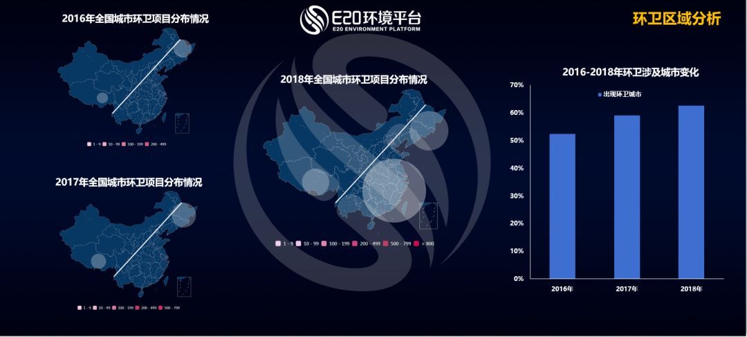 從區(qū)域分布角度看,E20研究院數(shù)據(jù)中心以胡煥庸線為界詳細(xì)分析了所有的城市(包括縣級(jí)市)的項(xiàng)目情況,根據(jù)區(qū)域抽樣可以看出,在2018年,環(huán)衛(wèi)項(xiàng)目分布密度最高的地區(qū)是經(jīng)濟(jì)發(fā)展程度較高的東南沿海,但值得注意的是,包括西南、東北等經(jīng)濟(jì)發(fā)展水平相對(duì)較差的地區(qū),環(huán)衛(wèi)項(xiàng)目均出現(xiàn)了大幅增加。上面圖片的右圖是當(dāng)前所有縣級(jí)市中出現(xiàn)環(huán)衛(wèi)市場(chǎng)化情況的占比變化。